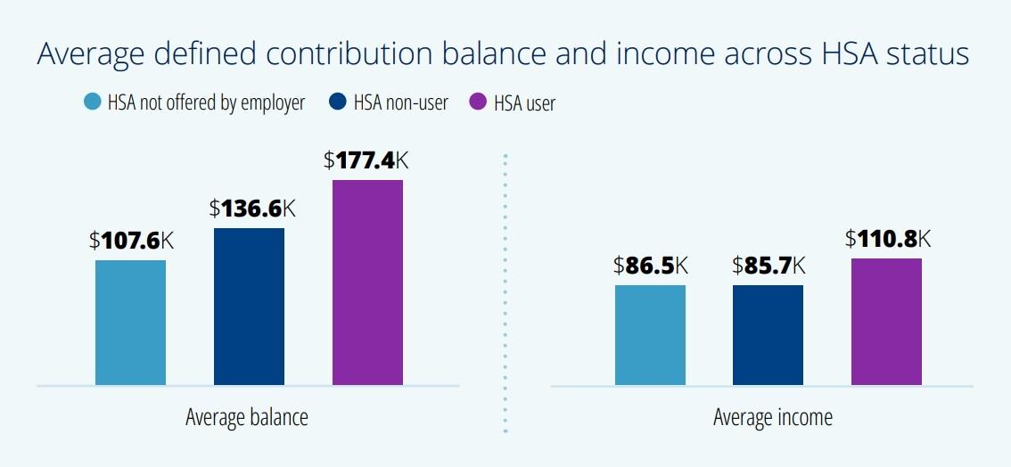 The average defined contribution balance and income across HSA status is $136.6K for HSA non-users compared to $177.4K for those who use HSAs. Among HSA users, one in five has more than $250K in plan assets.