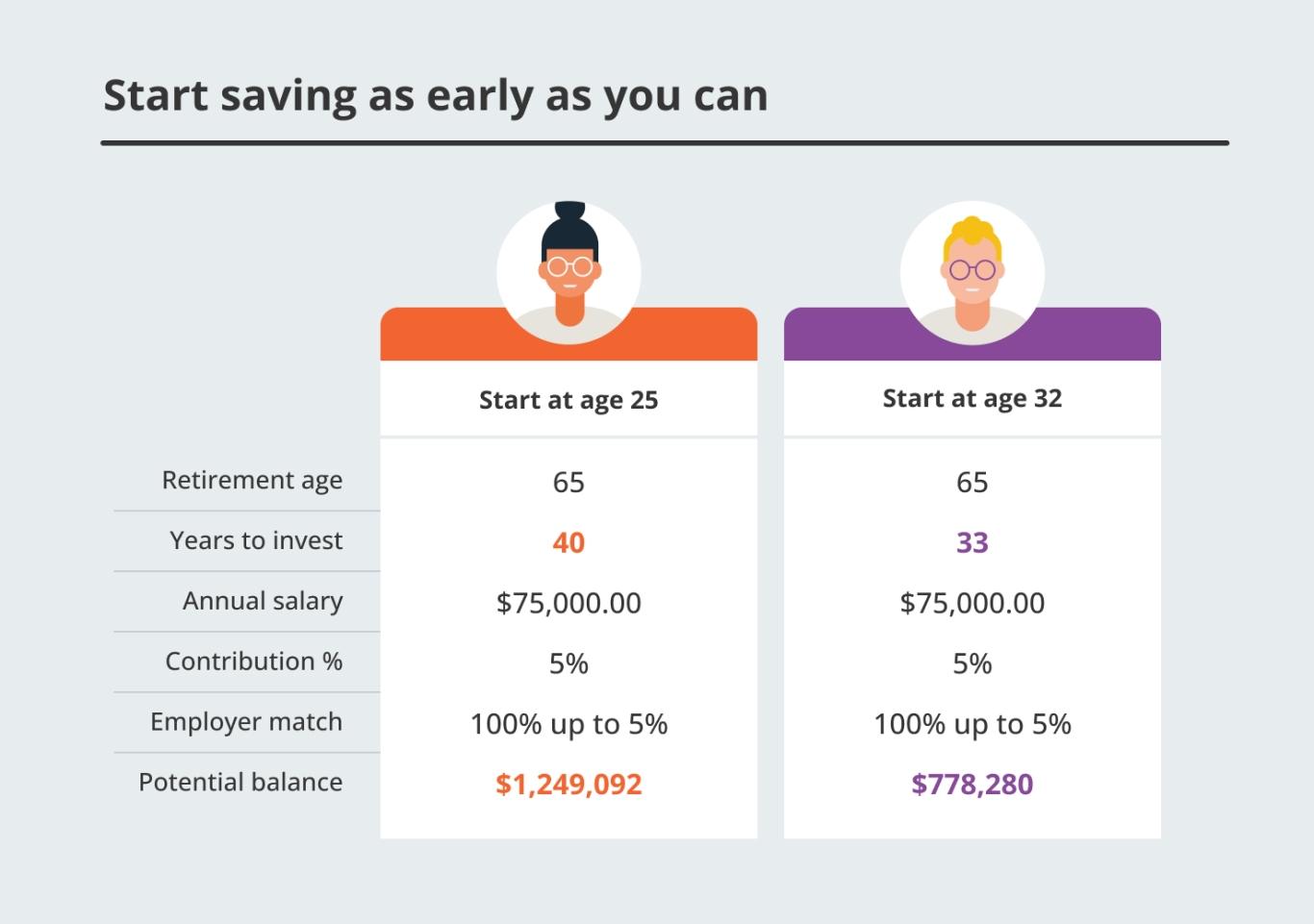FOR ILLUSTRATIVE PURPOSES ONLY. This is a hypothetical illustration to show the value of saving early; it is not intended as a projection or prediction of future investment results, nor is it intended as financial planning or investment advice. It assumes a 6% average annual rate of return, $75,000 starting salary with no increases invested over 40 years and 33 years. Rates of return may vary. This illustration does not include any charges, expenses or fees that may be associated with your program. Fees could change the outcomes provided.