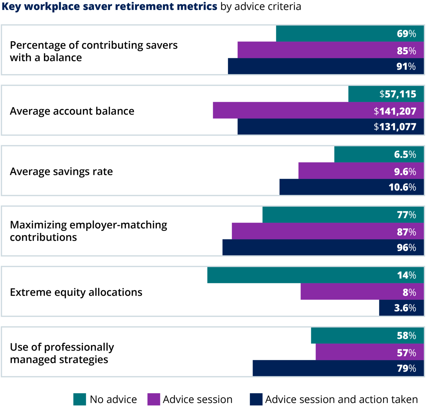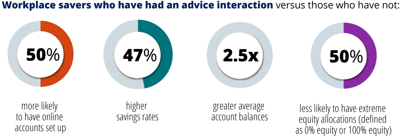 So far we’ve shown strong correlations between workplace savers who engage in advice sessions and positive retirement planning behaviors. Our research further shows that workplace savers are also taking action on, and implementing, the advice they receive.