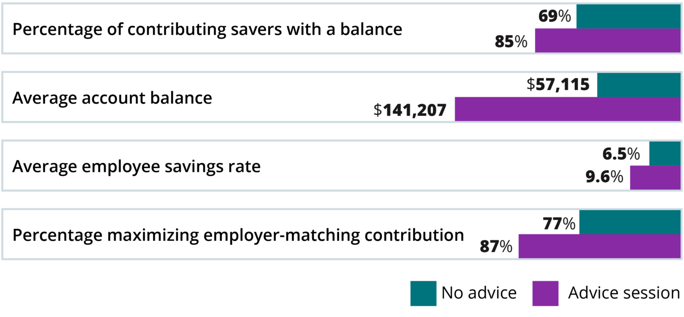 Advice, especially one-on-one interactions, provides individuals with personalized solutions that can inspire them to take control of their financial situations. Plan sponsors can help improve plan and workplace saver outcomes by: