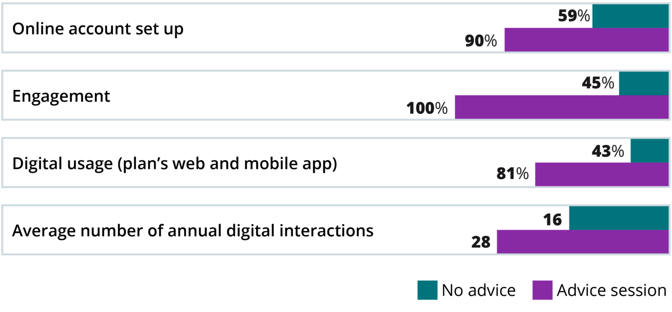 Like the positive correlation between advice sessions and key retirement planning metrics, many positive trends are further reflected by individuals who take action following their advice sessions.