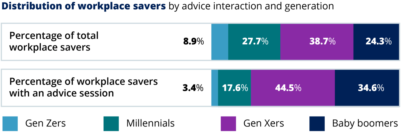 Retirement plan savers are more concentrated in older generations and more likely to take part in advice sessions than younger savers.