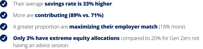 For example, Gen Zers who had an advice interaction in the past year are showing stronger savings behaviors than those who didn’t. |