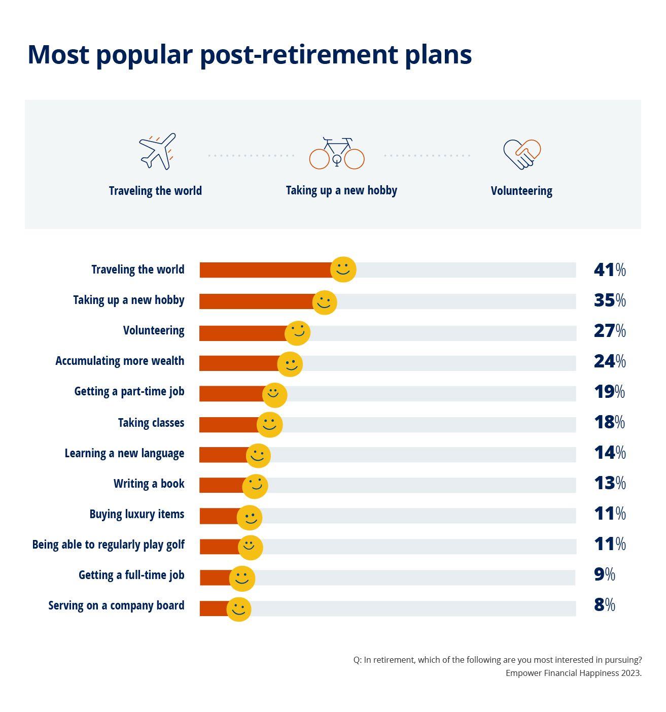 - Retirement dreams: The top three activities Americans are most interested in pursuing in retirement are travel (41%), hobbies (35%), and volunteer work (27%).
