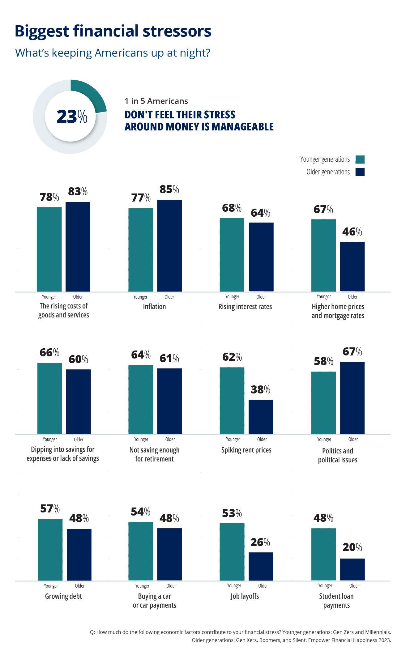 For nearly a third of Americans (27%), top financial stressors include talking about money. Nearly a quarter of Americans (23%) get stressed when they go out with people who have different budgets than them. One in 5 Millennials (22%) and Gen Zers (21%) get anxious comparing themselves to others, including scrolling through social media (32% of Gen Z and 20% of Millennials). Overall, younger generations stress most about high housing costs (67% vs. 46%), spiking rent prices (62% vs. 38%), growing debt (57% vs. 48%), job layoffs (53% vs. 26%), and student loan payments (48% vs. 20%).