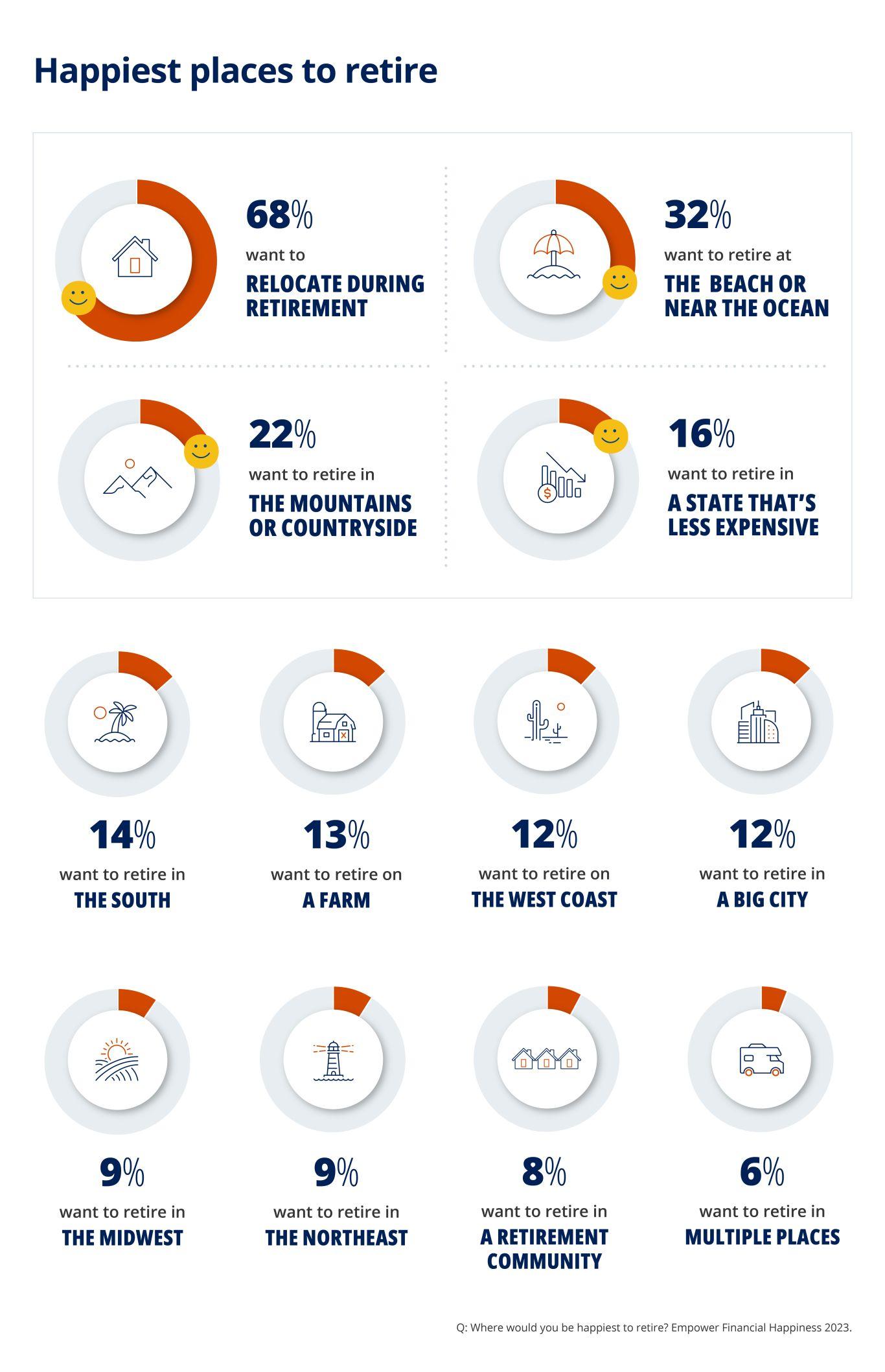 Around two-thirds of Americans are interested in relocating during retirement, with the top destinations being near the beach (32%) and in the mountains or countryside (22%). Nearly 1 in 5 Americans (16%) want to move to a less expensive state. Just 8% would be happiest in a retirement community.