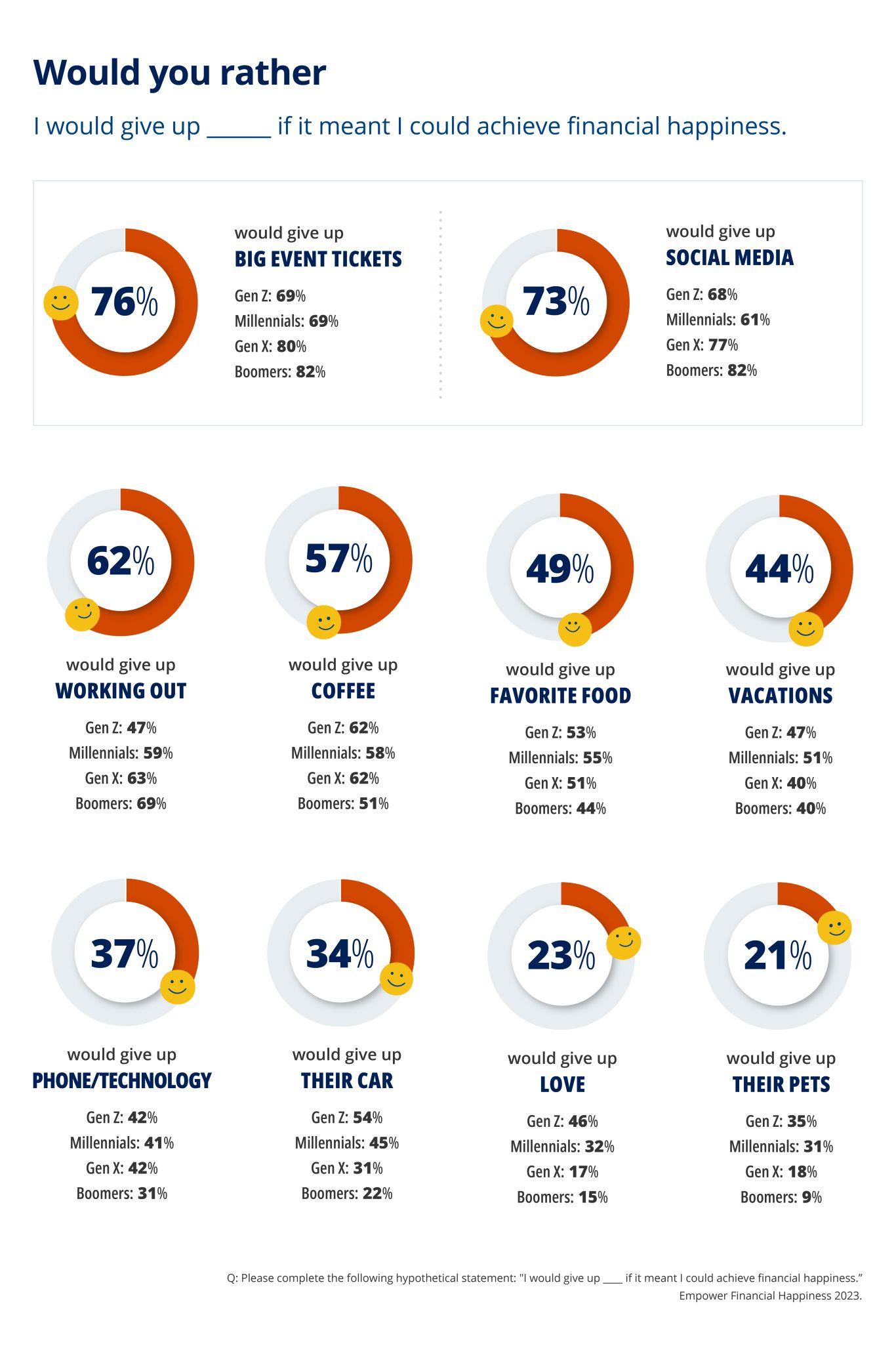 - Hooked on happiness: About three fourths of Americans would give up big-ticket purchases like the Super Bowl (76%) or social media (73%) to achieve financial happiness.