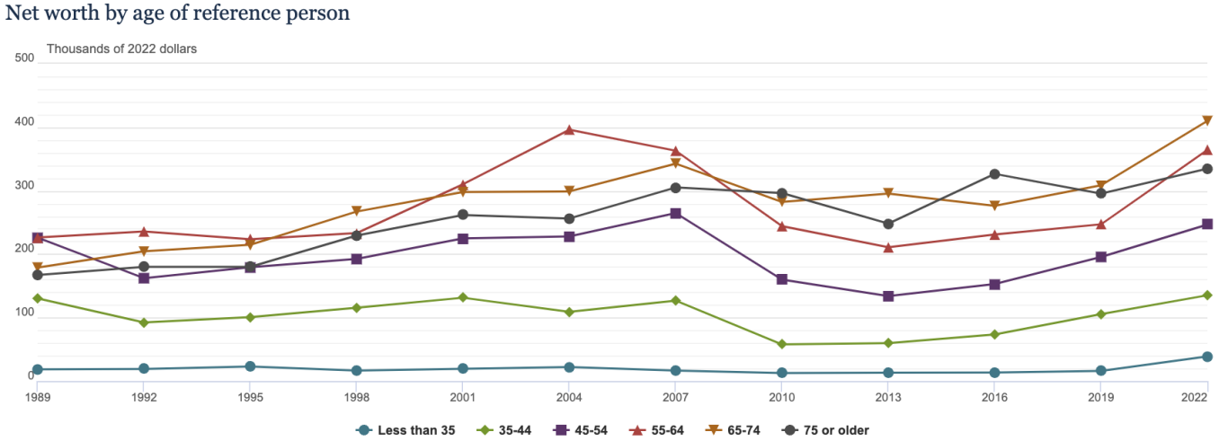 Median net worth by age. Source: The Fed - Chart: Survey of Consumer Finances, 1989 - 2022