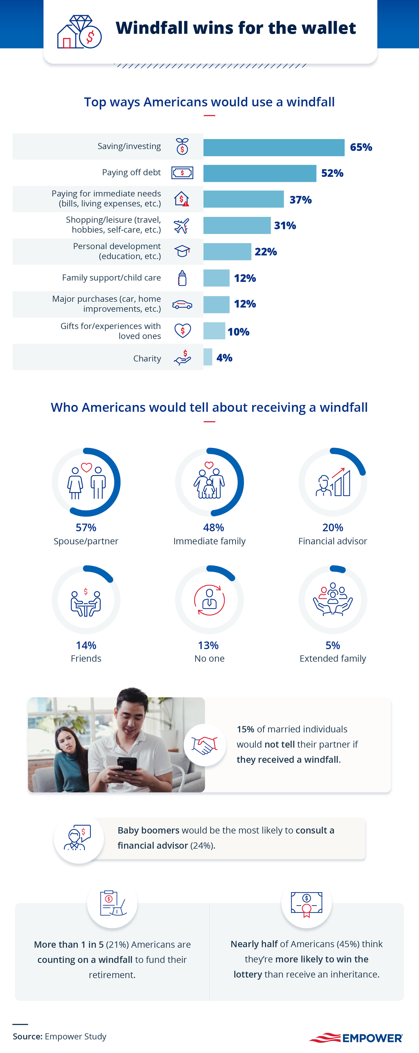 Across all generations, 65% of Americans would prioritize saving or investing any financial gains, 52% would allocate the money to pay down debt, and 37% would leverage the funds for immediate financial relief, like paying their bills. Upon receiving a windfall, 1 in 5 Americans would seek the help of a financial professional. Among those in relationships, 43% wouldn’t tell their spouse or partner about receiving a windfall.